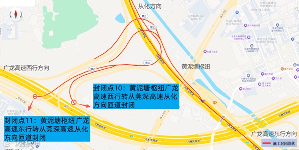 封闭点11:黄泥塘互通广龙高速东行转从莞深高速从化方向匝道实行全封闭交通管制。