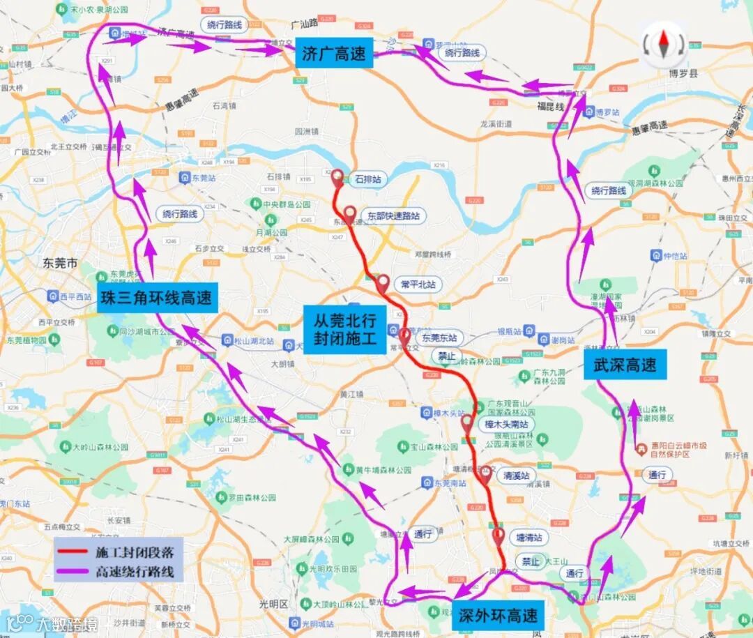 深外环东行去往从莞深高速北行车辆,可提前在黎光枢纽转珠三角环线高速绕行,或在清林枢纽转武深高速绕行;