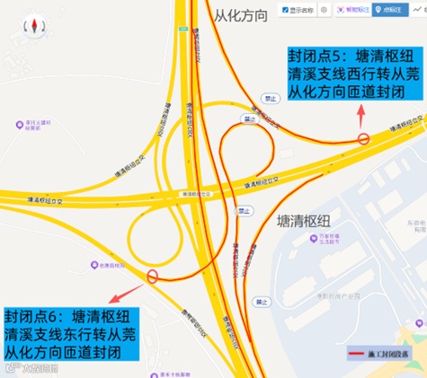 封闭点5:塘清枢纽清溪支线西行转从莞从化方向匝道;