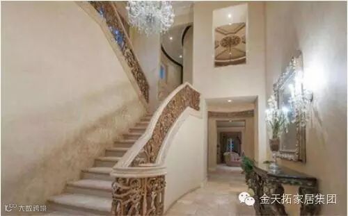 室内装修整体是采用了象牙白色和淡淡的黄色调,所以看起来非常的温馨舒适。通过楼梯转角处的装修,我们也能看出工艺精湛的雕花扶手,以及漂亮的白色水晶吊灯。