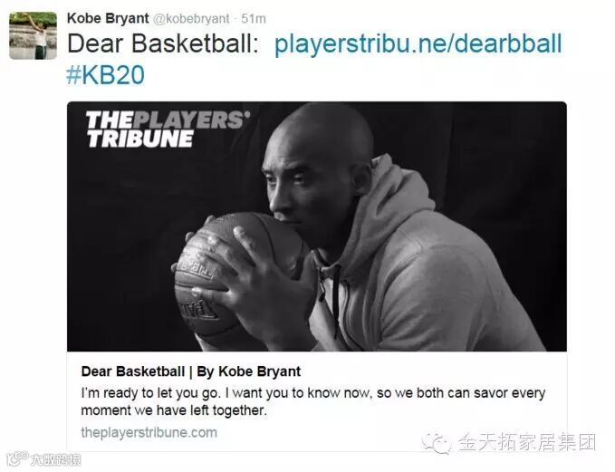 11月30日,科比在twitter亲自宣布赛季后退役,令整个北美体育界乃至世界篮球迷震惊,一代小飞侠在经历了20个光辉岁月后,写下了给篮球的一份深情告白。