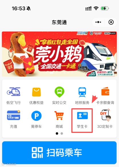 ①打开东莞通APP/东莞通微信小程序/东莞通支付宝小程序【学生卡】