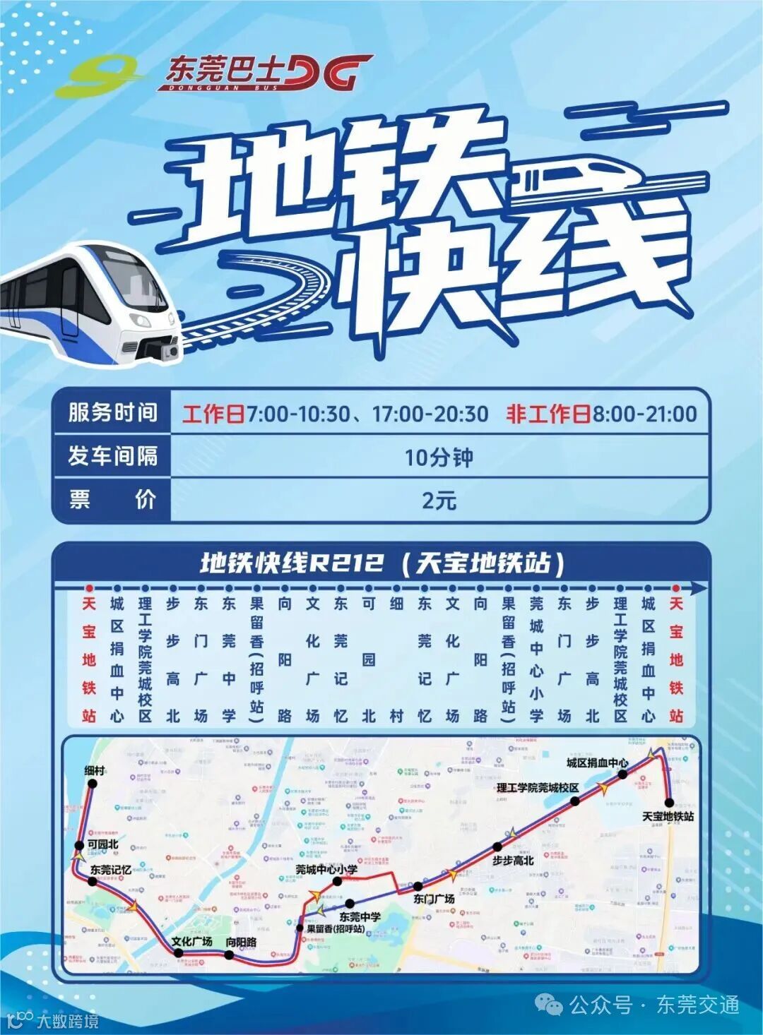 乘车Tips:市民朋友们可以乘坐东莞轨道交通2号线在“天宝”站下车,换乘“地铁快线R212”公交车前往“东莞记忆”