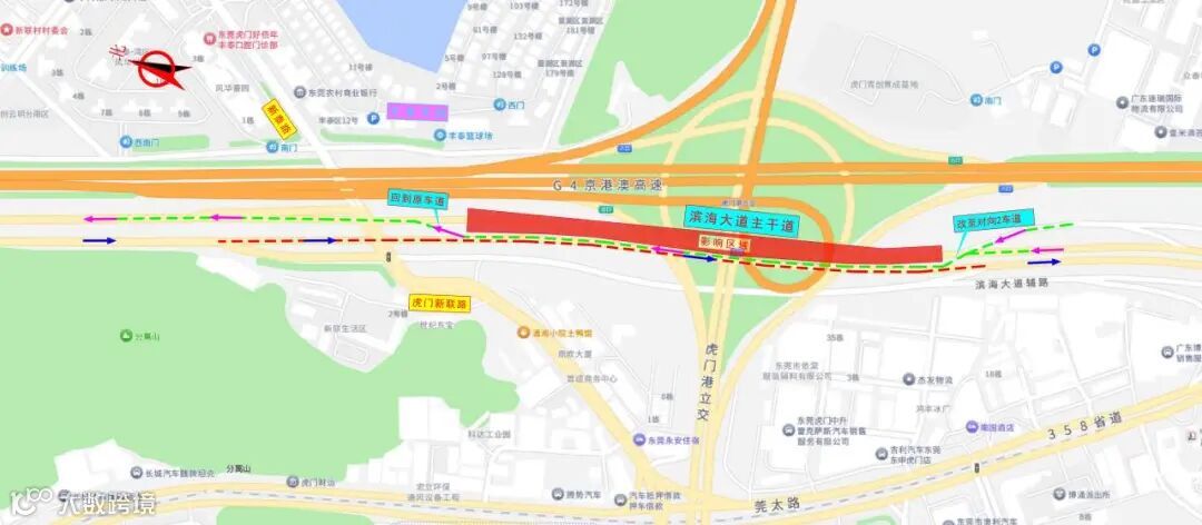 空间上“精准划界”:管制范围严格限定在滨海大道虎门新联路至莞太路口区间,施工期间主线车辆通过临时车道或借道绕行,确保区域交通网络有序运转。