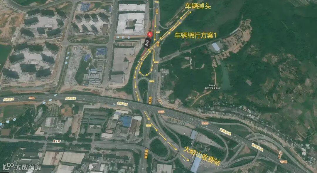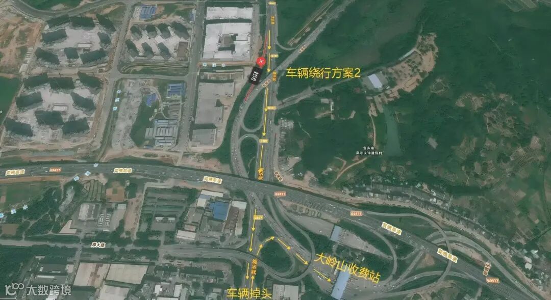 绕行方案2:封闭起点→莞长路→莞长路/杨朗路路口掉头→G匝道进入收费站。绕行距离约4km。