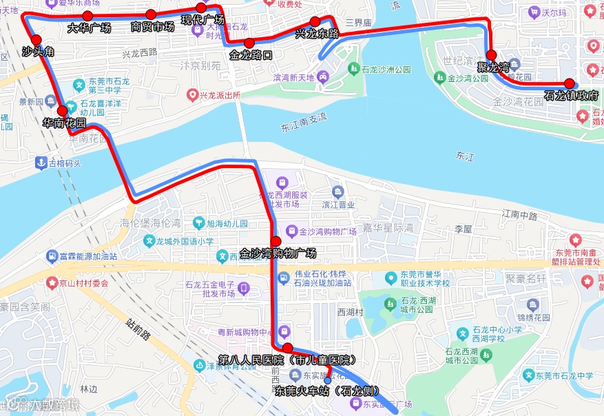 东莞火车站(石龙侧)、第八人民医院(市儿童医院)、金沙湾购物广场、华南花园、沙头角、大华广场、商贸市场、现代广场、金龙路口、兴龙东路、聚龙湾、石龙镇政府