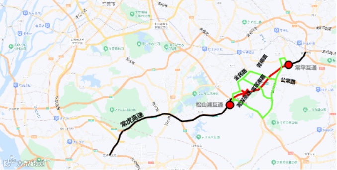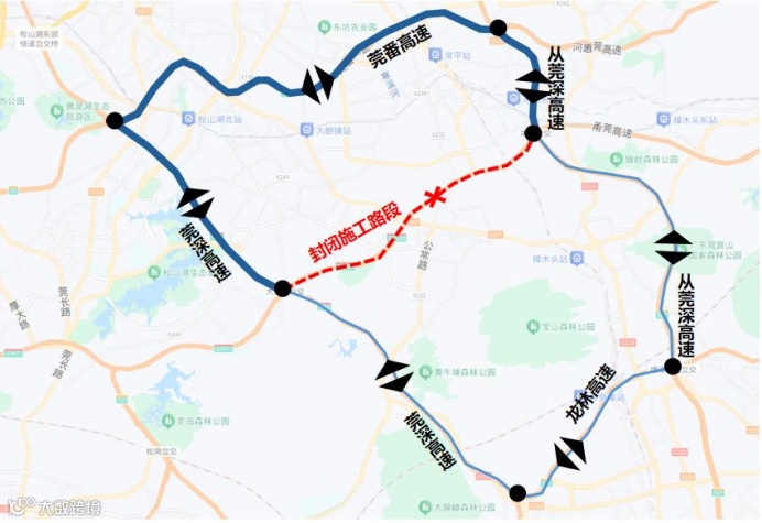 分流路径(广州方向西行)2:常虎高速—从莞深高速—龙林高速—莞深高速—常虎高速。