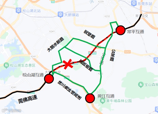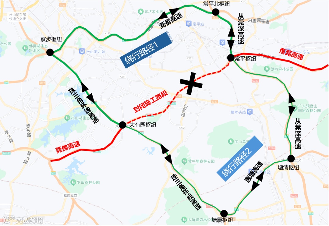 绕行路径1:莞佛高速—松山湖互通—屏安路—大朗水新路—莞樟路/富民南路—公常路—常平互通—甬莞高速;