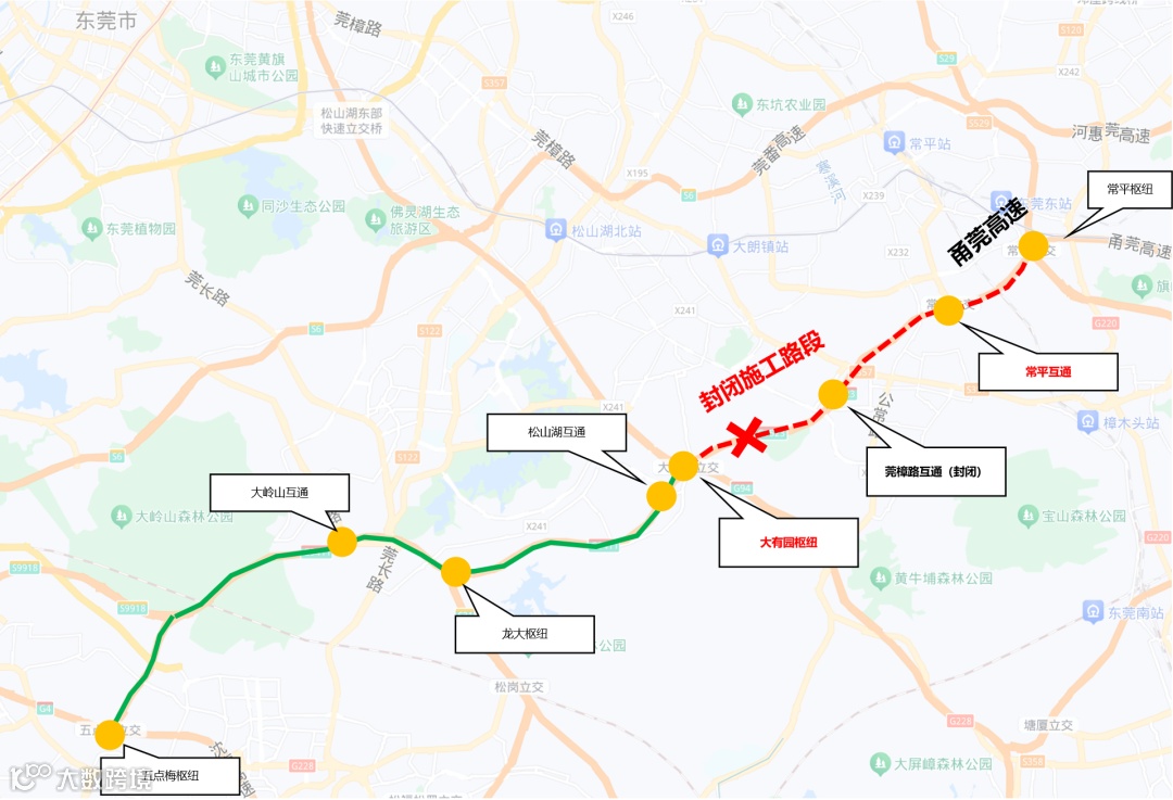 封闭区段自大有园枢纽起,止于常平枢纽,封闭里程约为13.4km。具体交通管制点如下: