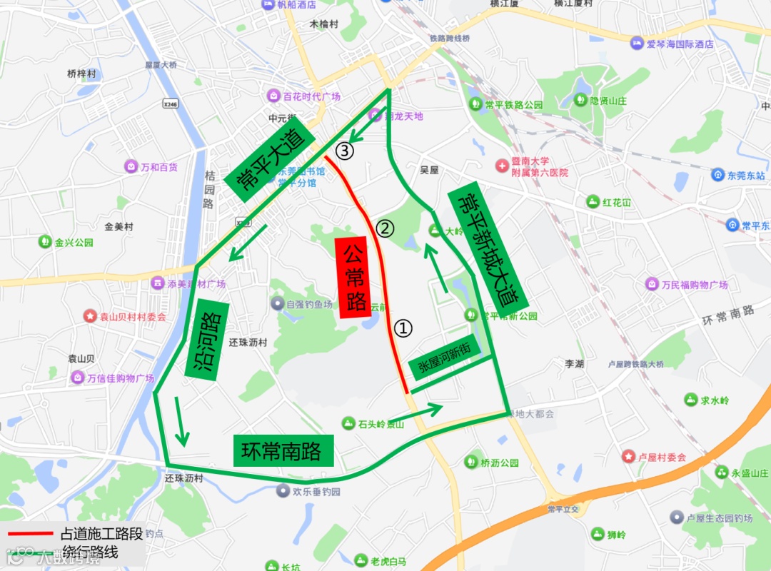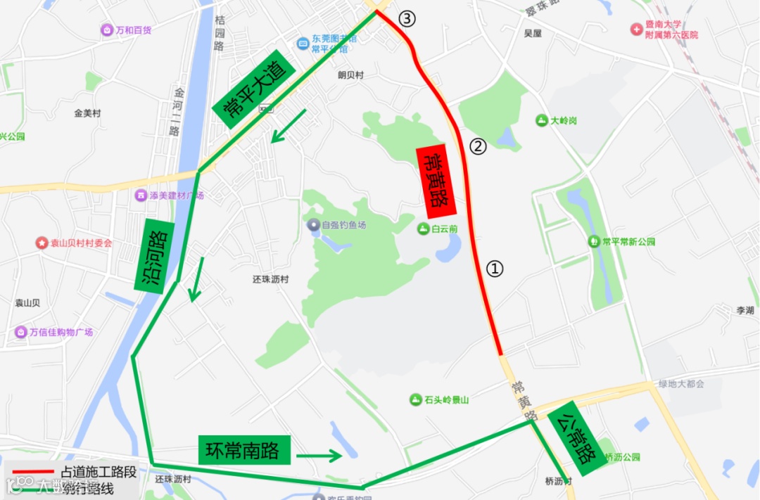 (二)常黄路前往黄江方向:由常平大道绕行沿河东/西路、环常南路;也可由翔龙天地转新城大道,经环常南路进入常黄路往黄江方向行驶。