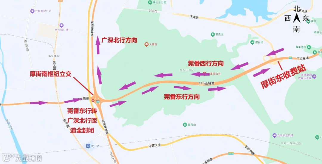 建议计划北上的车辆提前在厚街南枢纽立交往南行(深圳方向)匝道行驶从太平收费站出站,出站后利用地方路绕行再进入太平收费站上高速,往广深高速北行(广州方向)行驶。