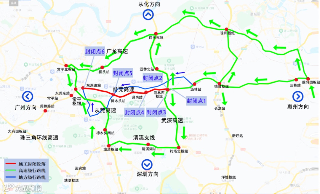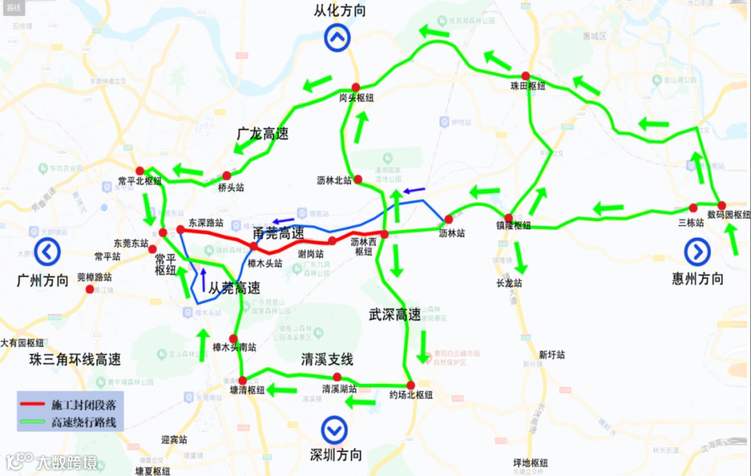 地方绕行路线:前往樟木头、谢岗、东深路方向车辆,从甬莞高速惠州段沥林站驶出,经S357莞樟东路、G220东深路至东深路站。