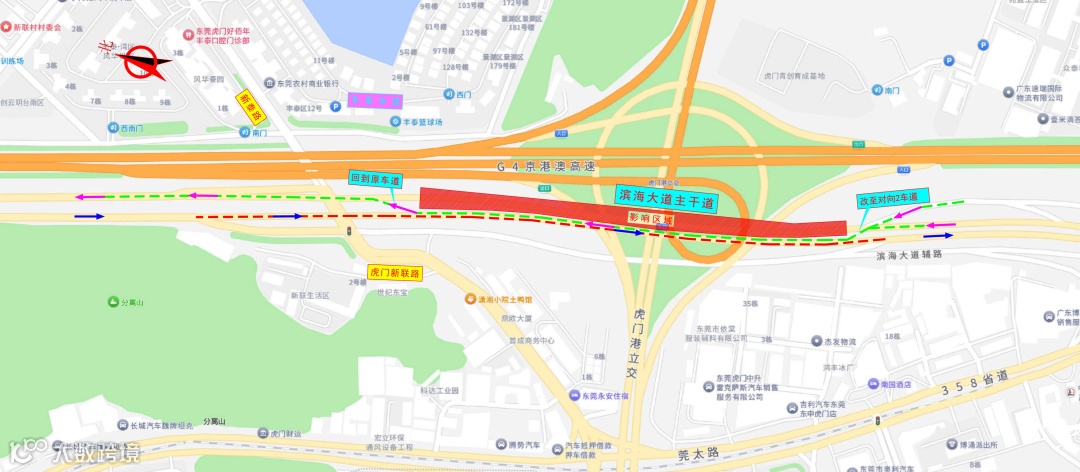 自滨海大道主干道上跨虎门新联路交叉口处起,即K1+300里程位置,往南760m通过虎门港高速后,止于K2+060处,北行主干道封闭。具体封闭位置如下: