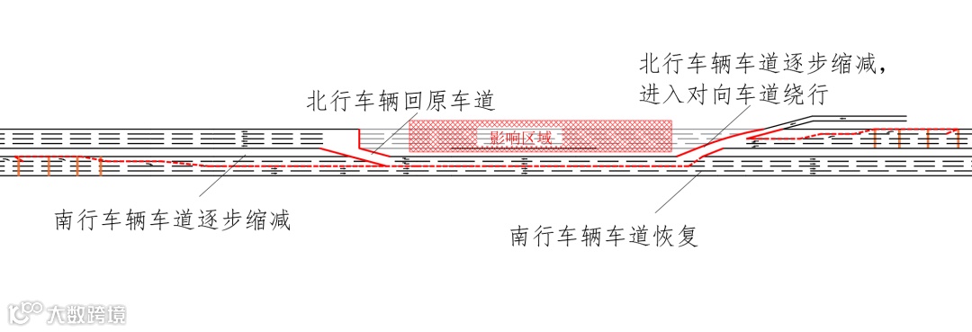 北行机动车从主干道K2+060位置从中央分隔带进入南行2车道,沿主干道行驶约760m后从K1+300位置中央分隔带处开口回原车道;南行车辆缩减为2车道通行。
