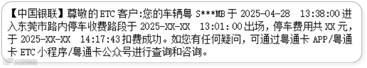 ETC扣费后,你会收到短信提醒,明细包括进出入场时间、扣费金额等。