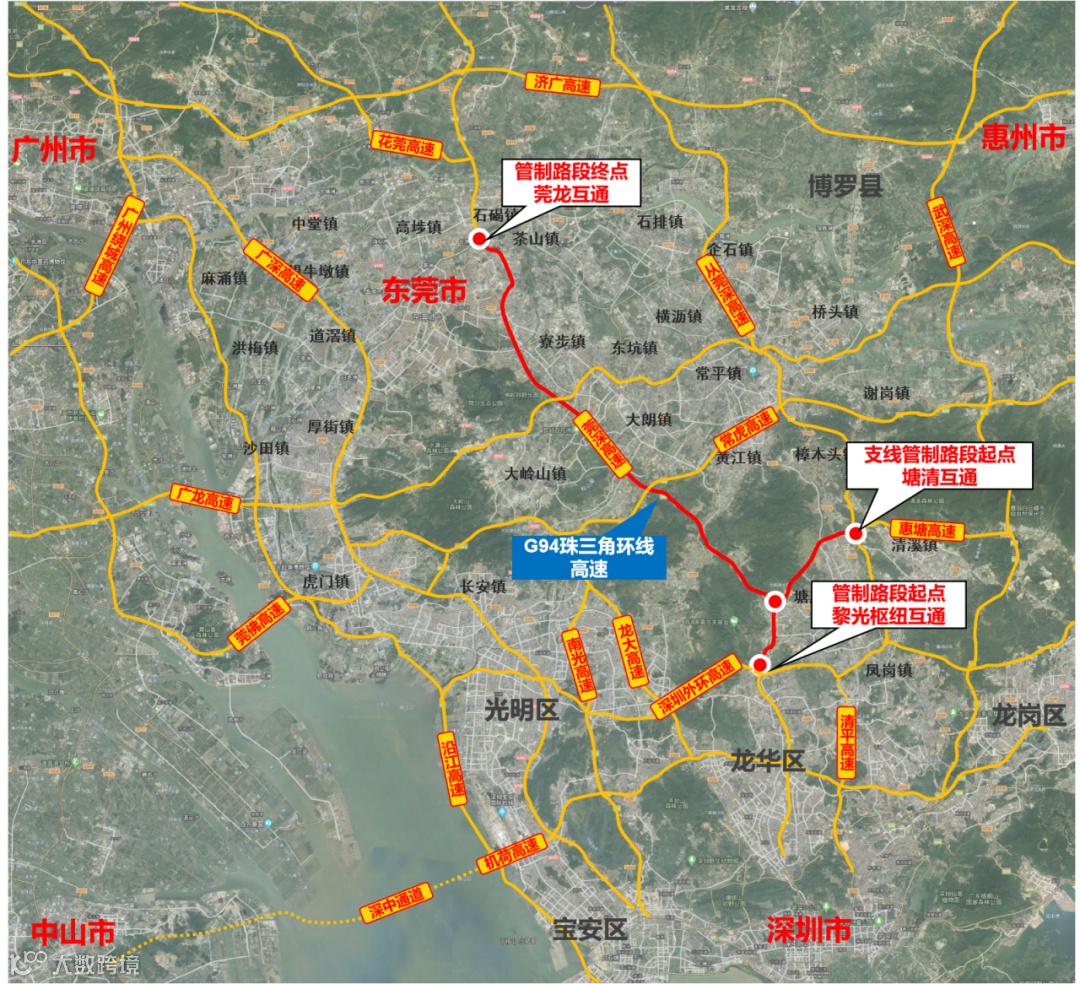 莞深高速主线管制路段起点位于G94珠三角环线高速黎光枢纽互通北侧,终点为G94珠三角环线高速莞龙互通南侧;龙林支线管制路段起点位于G94珠三角环线高速塘厦枢纽互通,终点为S22惠塘高速塘清枢纽互通西侧。具体限速路段如下:
