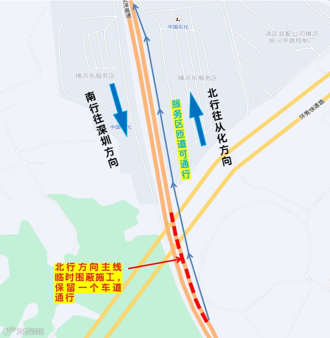 1.从莞高速(南行往深圳方向)K87+000-K88+000段主线,占道施工期间主线保留一个车道间断性通行(施工期间主线剩余的一个通行车道采取间断性封闭,每次封闭时长约30分钟),可利用横沥东服务区匝道借道通行,南行方向管制期间北行(往从化)方向不受影响,正常通行。