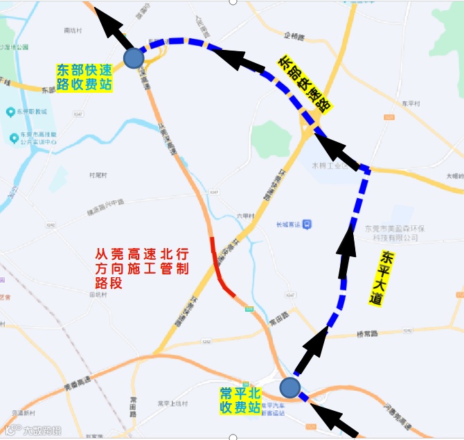 路线为:常平北收费站→东平大道→东部快速→东部快速路收费站→从莞高速