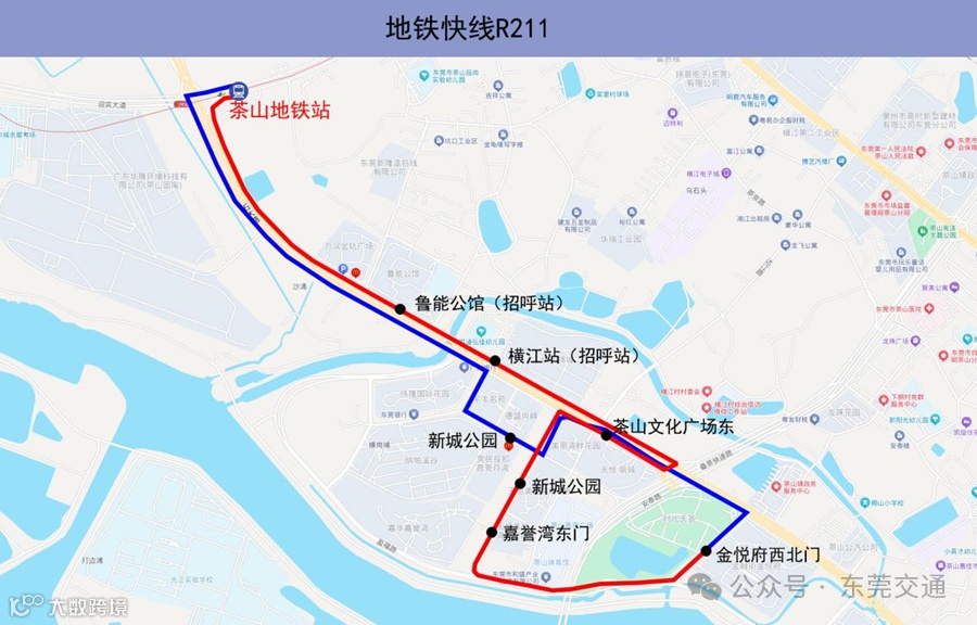 6.途经站点:金悦府西北门、嘉誉湾东门、新城公园、茶山文化广场东(招呼站)、横江站(招呼站)、鲁能公馆(招呼站)、茶山地铁站
