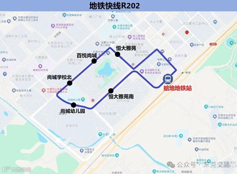 6.途经站点:蛤地地铁站、恒大雅苑南、尚城幼儿园、尚城学校北、百悦尚城、恒大雅苑、蛤地地铁站