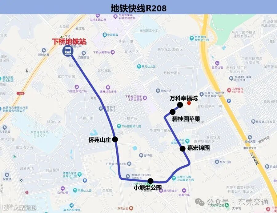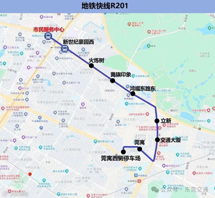 6.途经站点:虎英公园首末站、愉景花园、莞翠村、星河传说、新世界花园、东城中心、东城地铁站