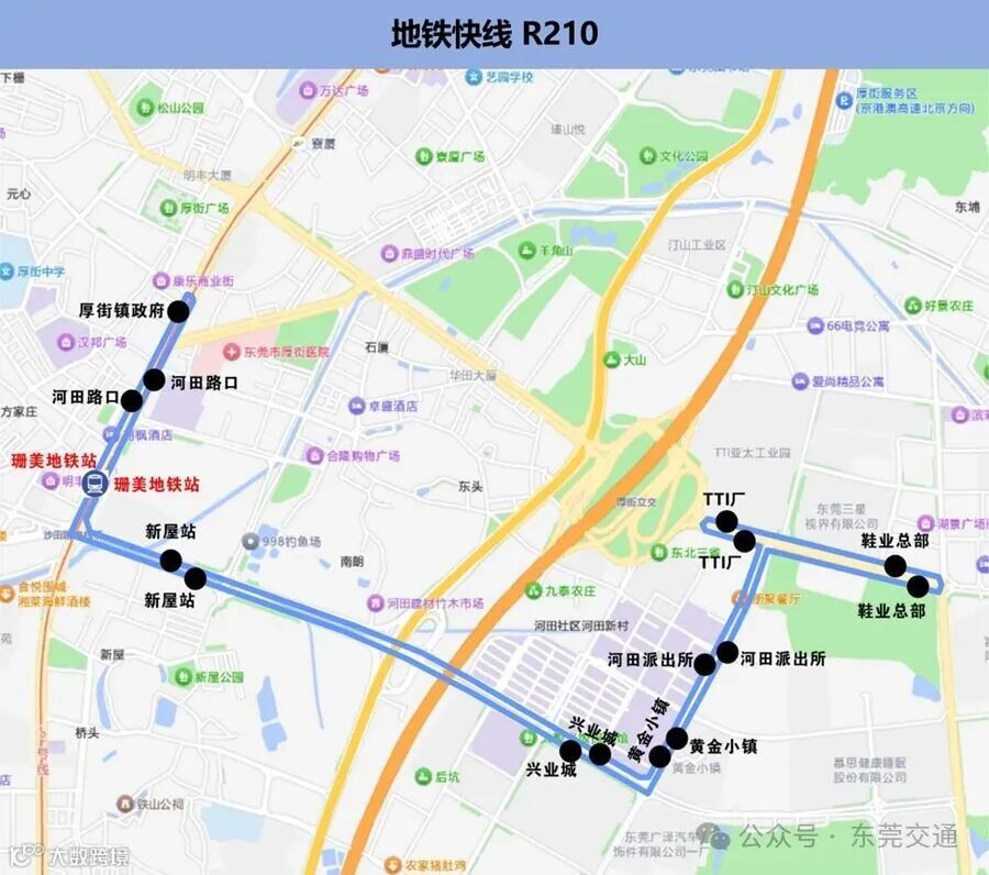 6.途经站点:厚街镇政府、河田路口、珊美地铁站、新屋站、兴业城、黄金小镇、河田派出所、鞋业总部、TTI厂