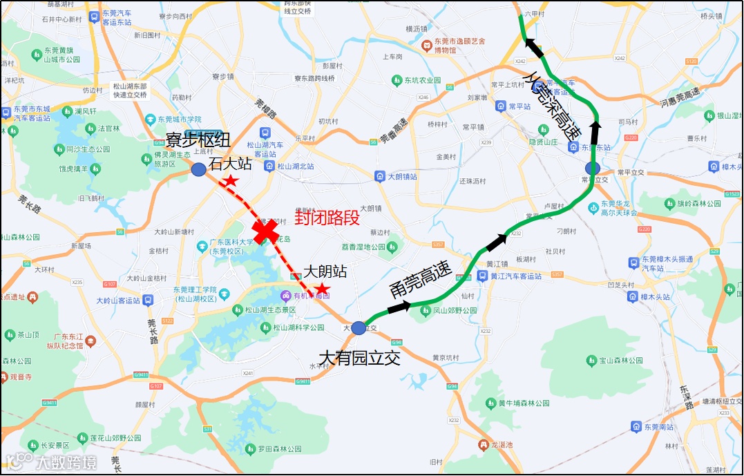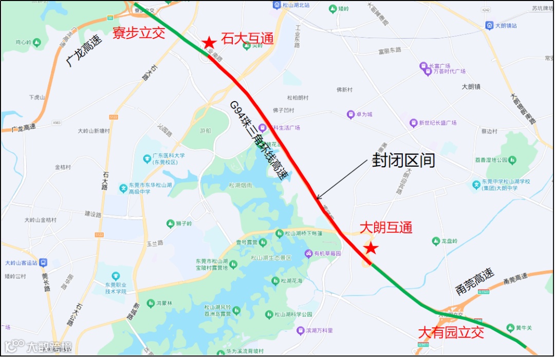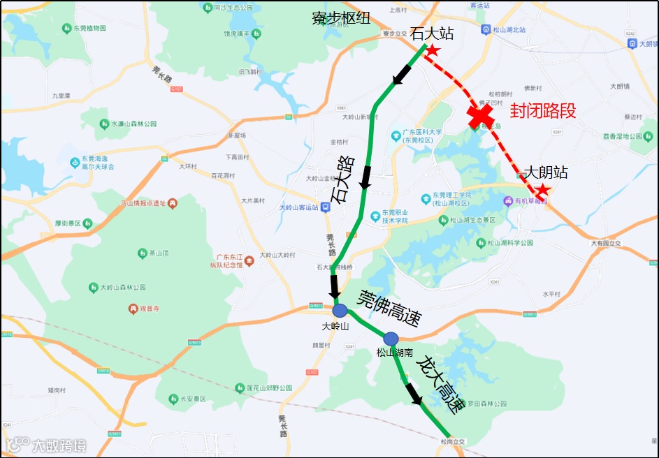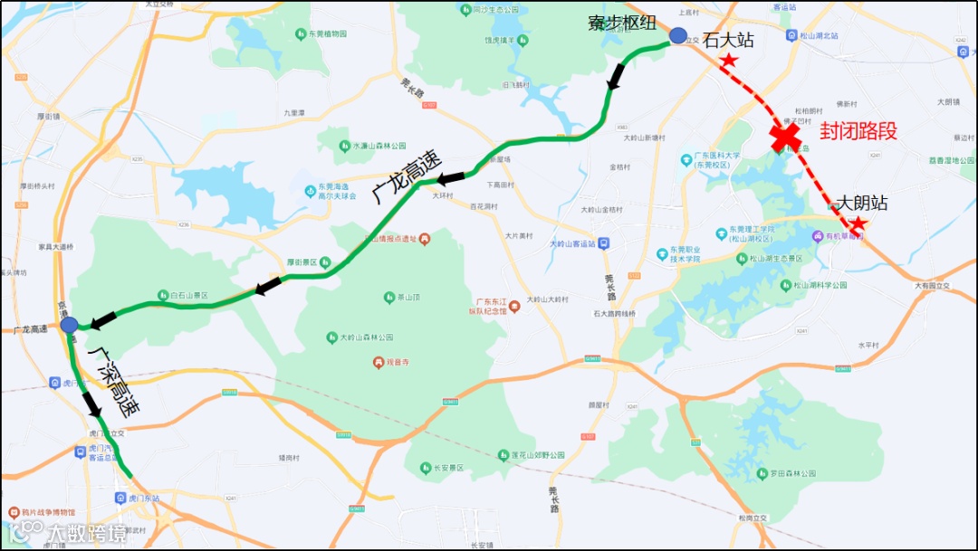 封闭区间自大朗收费站起,止于石大收费站,封闭里程约7km。具体封闭区域如下:
