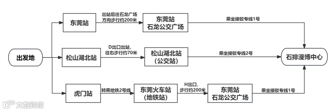 乘坐高铁、动车、城际列车出行的参展商和观众选择东莞站/虎门站下车后乘坐地铁+公交接驳专线抵达石排漫博中心。展会期间,出站后可按以下方式换乘: