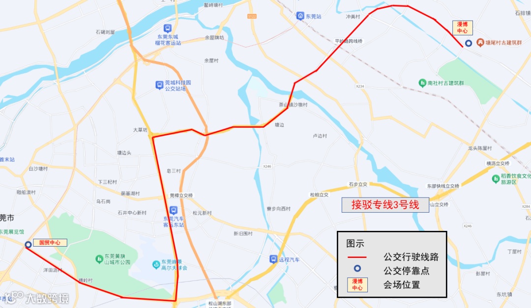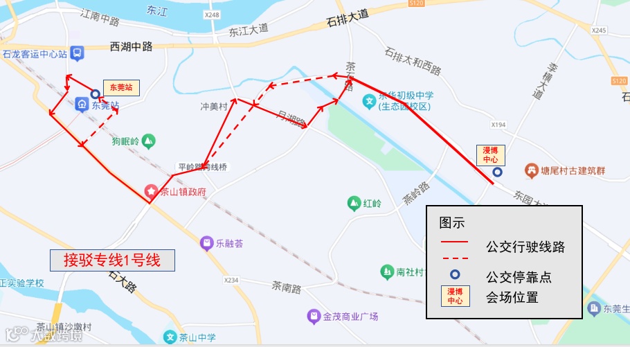 1号线:东莞站↔漫博中心 (车程20分钟)🔷 上车点(东莞火车站石龙公交广场)