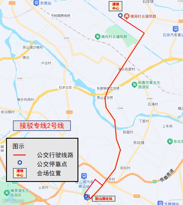 2号线:松山湖北站↔漫博中心 (车程45分钟)🔷 上车点(松山湖北站公交站)