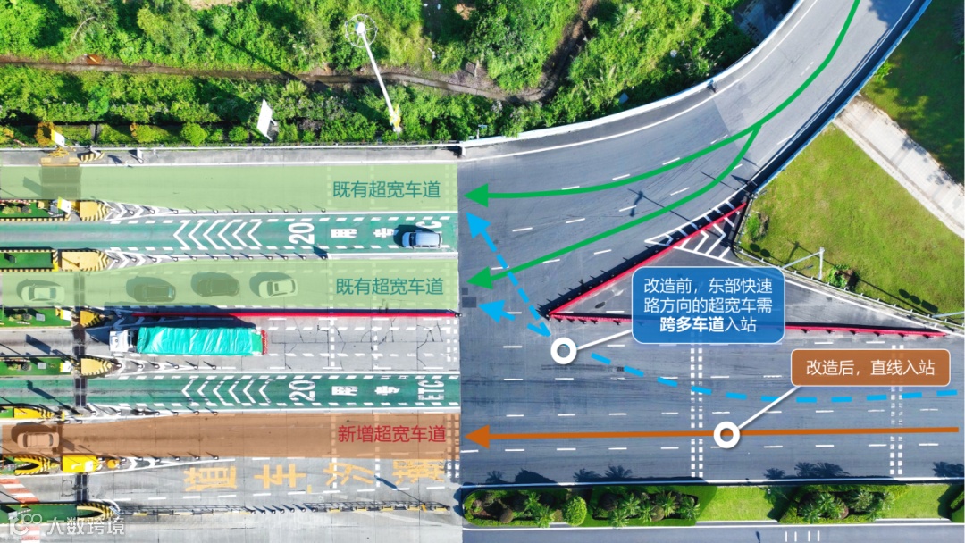 针对入口松山湖方向匝道车流与东部快速方向匝道车流在入口广场交织的现象,交控集团实施精准管控,在交织口使用加密排放的路锥进行渠化隔断,同步增加清晰的指示标牌,加强一线人员现场指挥,引导车辆有序通行,有效避免车流交织冲突。同时,将1条入口车道由3.2米拓宽至4米,让东部快速路方向的超宽货车可以直线通行入站,无需跨车道行驶至广场右侧车道。