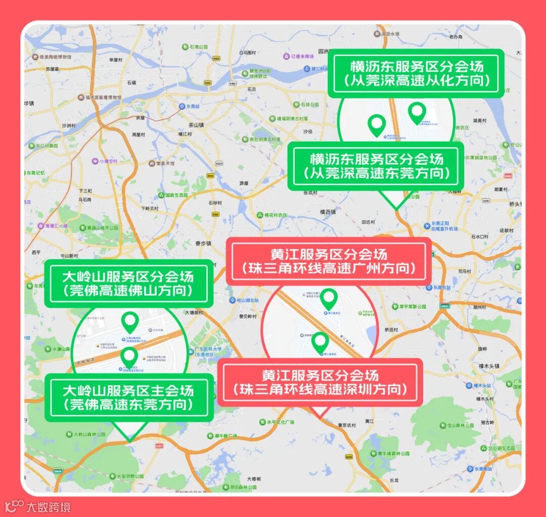此次活动的最大亮点,在于其依托高速服务区这一独特交通节点构建起的“黄金三角”。主会场设于莞佛高速大岭山服务区(东莞方向),扼守东莞西南门户,车流密集;分会场则精准布局于莞佛高速大岭山服务区(佛山方向)、珠三角环线高速黄江服务区(双向)与从莞深高速横沥东服务区(双向)。三大服务区覆盖了东莞对接广深、辐射粤东粤北的核心高速干线,形成一条贯穿南北、联动东西的“荔香走廊”。