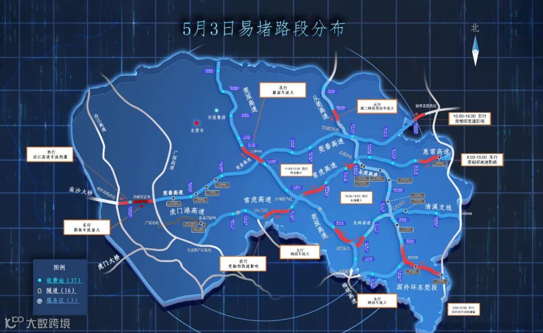 预计5月3日车流量达197万车次,高峰时段将出现在9时至11时和15时至20时,预判有11处易堵路段:包括虎岗松山湖站-龙大互通、虎岗莞樟路站-大有园互通、虎岗东莞东站-常平站、虎岗谢岗站-冷水坑隧道、从莞东部快速路站-从莞互通、深外环凤岗互通-清林隧道、沿江互通-厚街南互通、莞番桥头东站-河惠莞互通、莞深寮步互通-管理中心站、莞深龙林互通-黄江站、莞深龙林互通-迎宾站。5月3日易堵路段分布见下图——