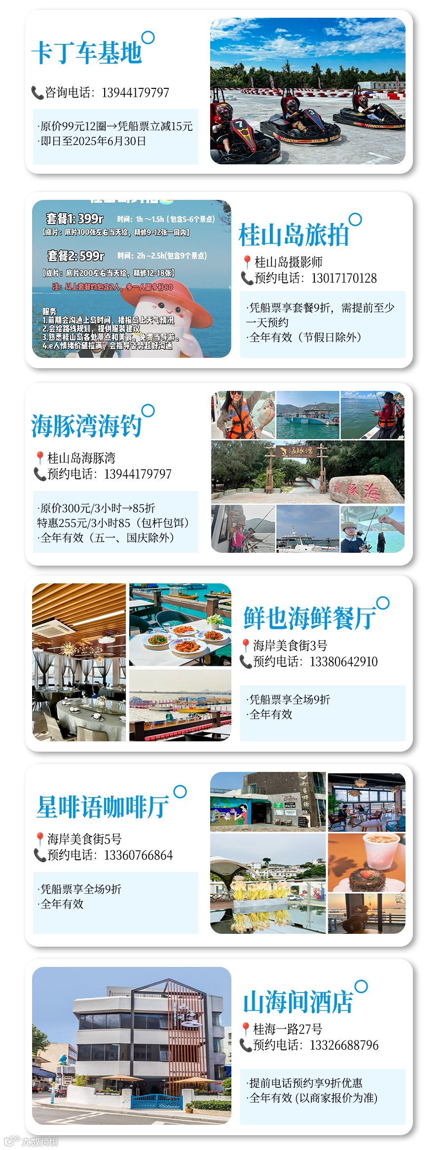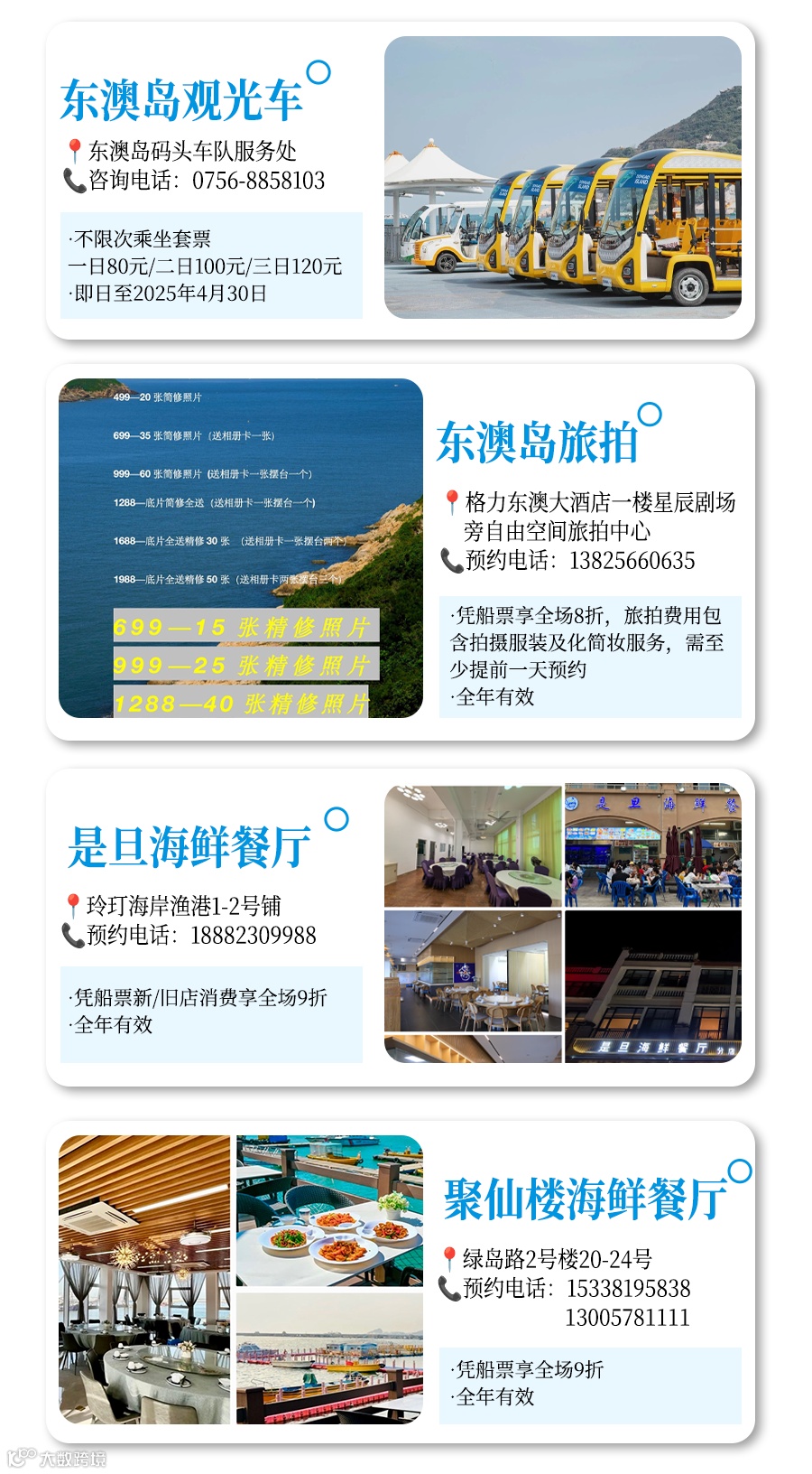 助力你收获一个难忘的海岛假期,登岛后的吃喝玩乐的福利,也给你通通安排上啦!凭虎门客运码头船票(实体/电子均可),即可享受两岛上述合作商家宠粉礼遇,必须小本本码住✍