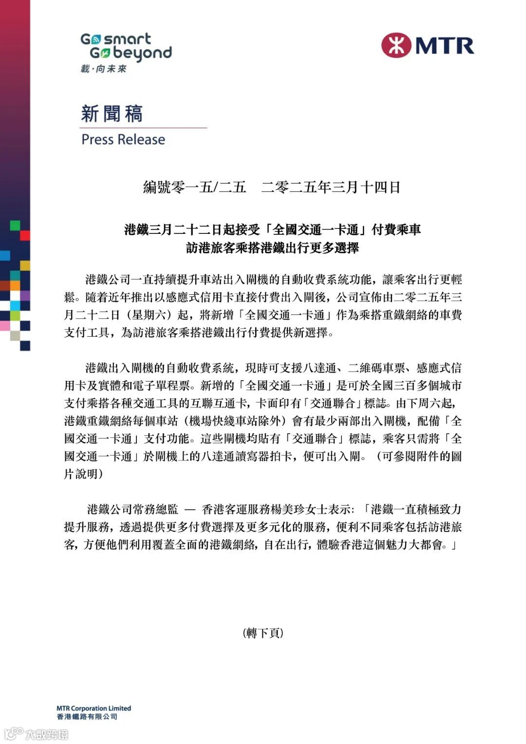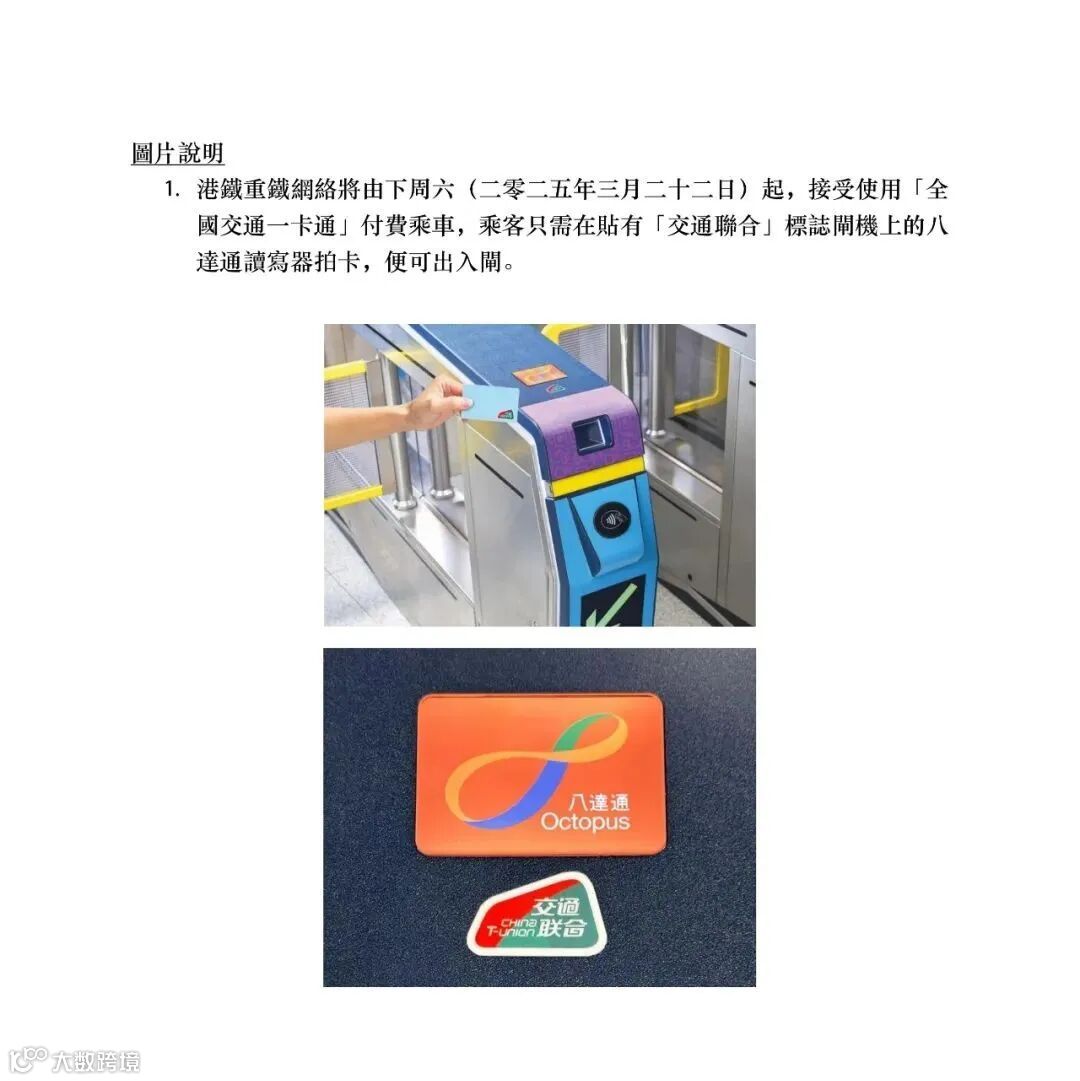 据香港铁路有限公司对外发布信息,2025年3月22日起,香港地铁将接受使用“全国交通一卡通”付费乘车。