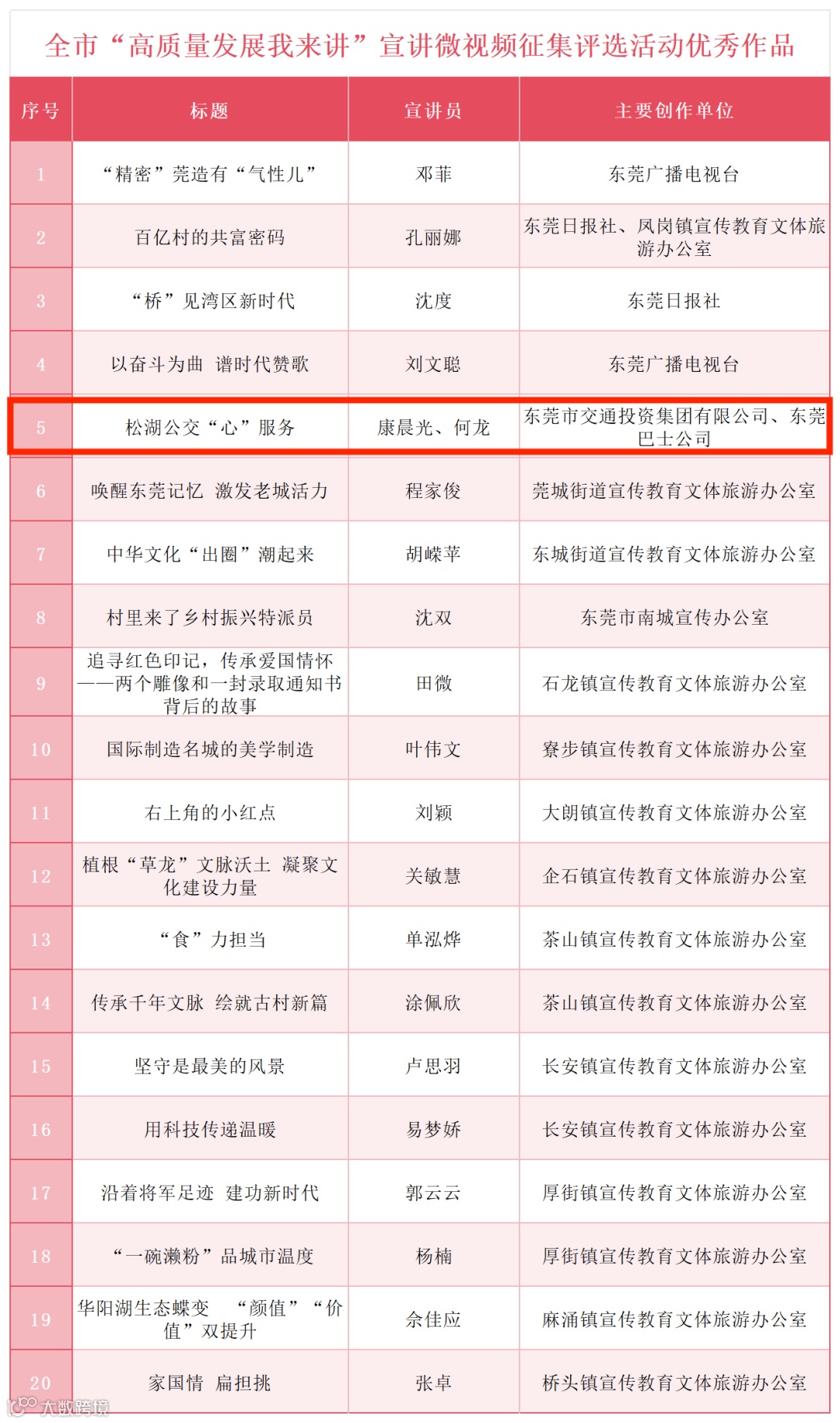 近日,东莞广播电视台公布了2024年“高质量发展我来讲”宣讲微视频获奖名单,由东莞交投集团推送的《松湖公交“心”服务》微视频获评优秀作品。