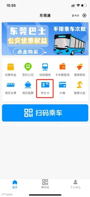 步骤3:点击东莞通APP【学生卡】或东莞通微信小程序【学生卡】。