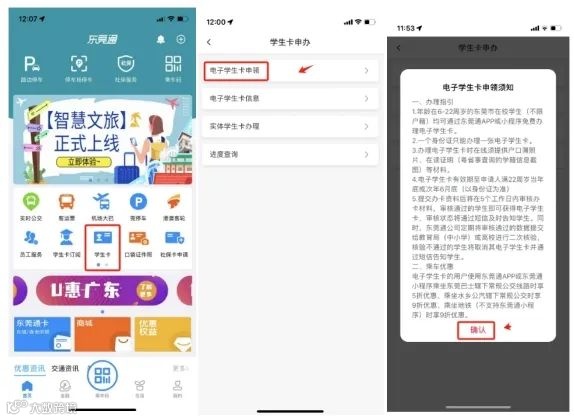 打开东莞通APP或东莞通小程序——点击首页“学生卡”——点击“电子学生卡申领”并确认须知。