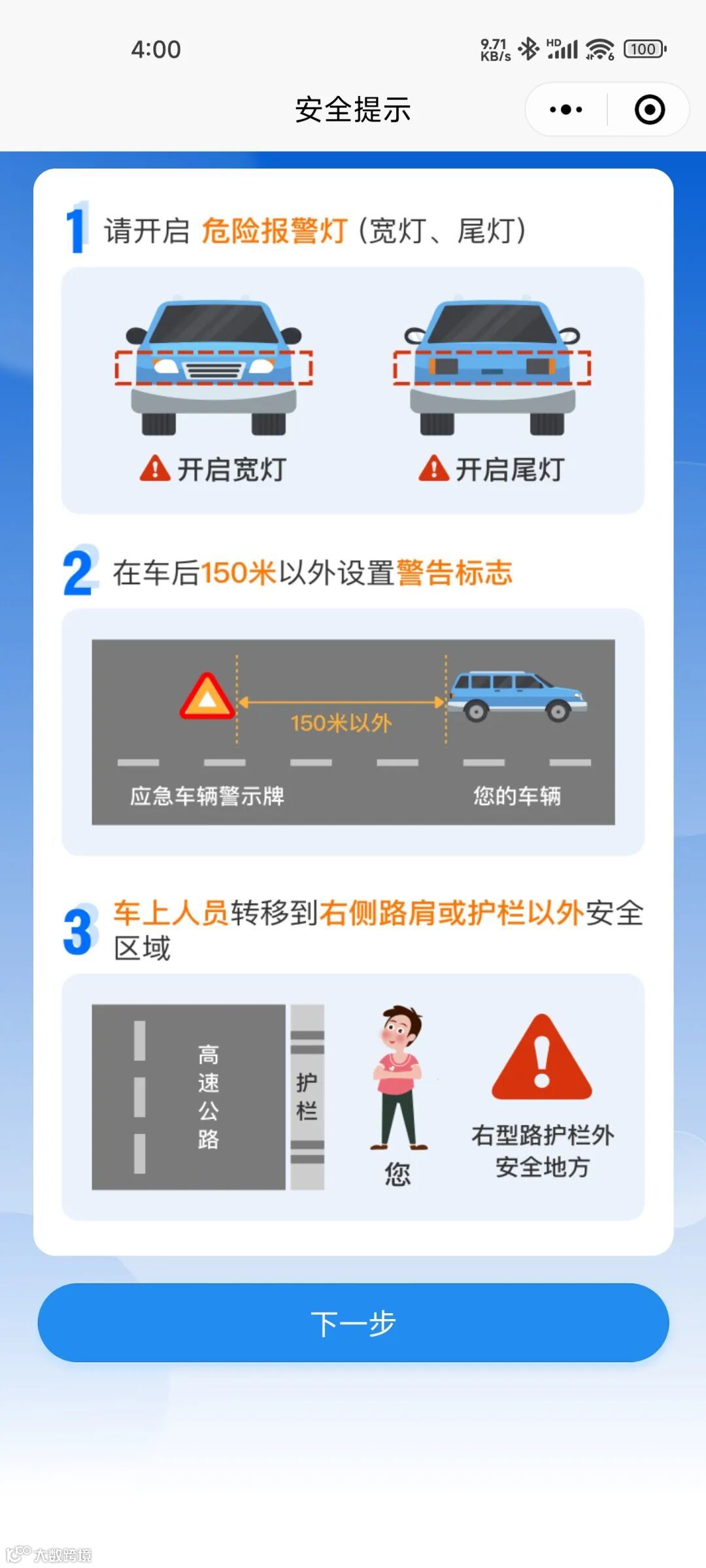 当在高速上遇到紧急情况时,首先一定要牢记做好“车靠边、人撤离、即报警”,即开启车辆危险报警灯,在车辆后方(150米以外)设置警告标志,车上人员转移到右侧路肩或护栏以外安全区域,随即报警求助进行处置,避免造成道路拥堵或者发生二次事故。