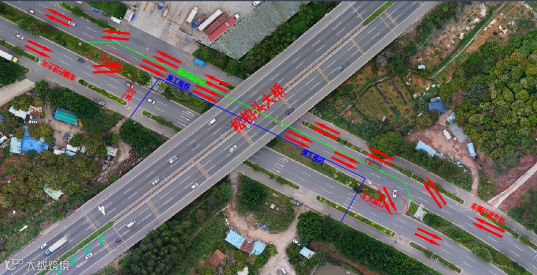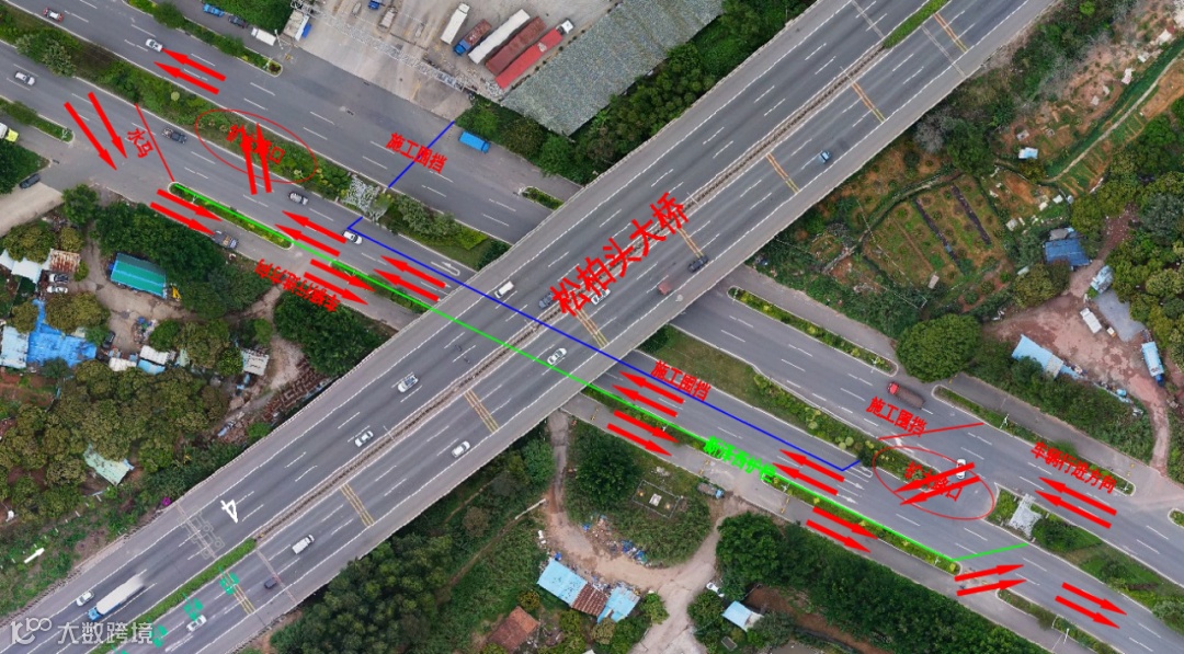 甬莞高速松柏头大桥拼宽桥现浇箱梁施工,需封闭富民南路黄江至大朗方向半幅车道,借用另半幅车道进行交通疏导;封闭时间2025年4月20日至2025年7月30日,示意图如下: