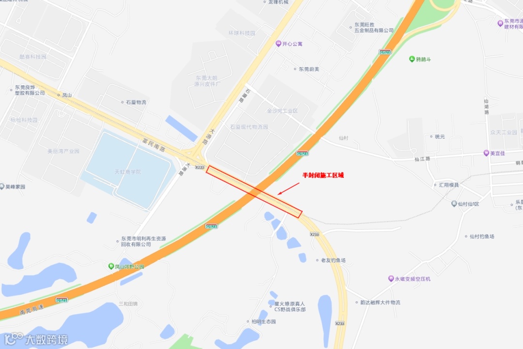 甬莞高速松柏头大桥拼宽桥现浇箱梁施工,需封闭富民南路大朗至黄江方向半幅车道,借用另半幅车道进行交通疏导;封闭时间2025年7月30日至2025年9月30日,示意图如下: