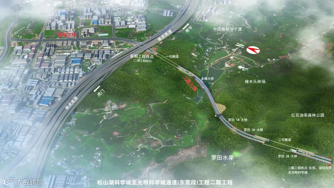 松山湖科学城至光明科学城通道(东莞段)二期工程建成后,东莞松山湖和深圳光明两座科学城的车程将缩短至20分钟,进一步畅通大湾区创新走廊内科技元素的流通,促进人、财、物的流通。