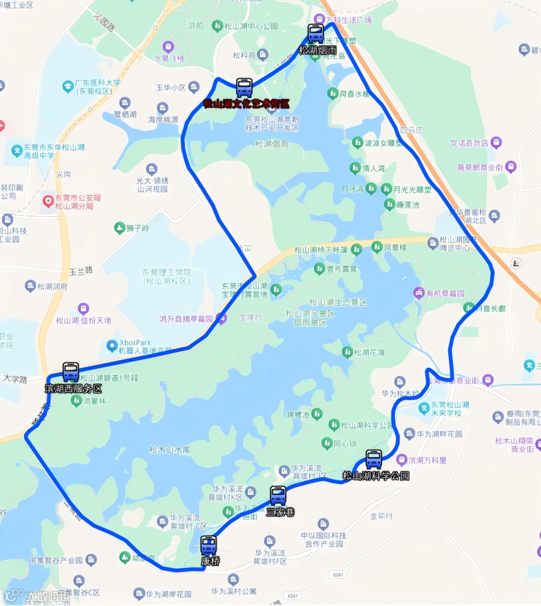 松山湖文化艺术街区—松湖烟雨—松山湖科学公园—三家巷—康桥—滨湖西服务区—松山湖文化艺术街区