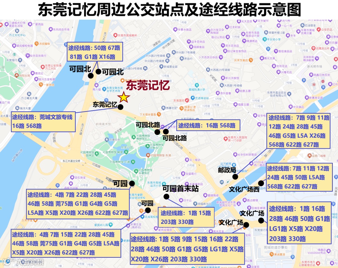 莞城文旅专线沿线站点:东莞记忆→可园→莞城市民广场→鸿福商业中心→市民服务中心→西平地铁站B出口→市民服务中心→鸿福商业中心→莞城市民广场→东莞记忆