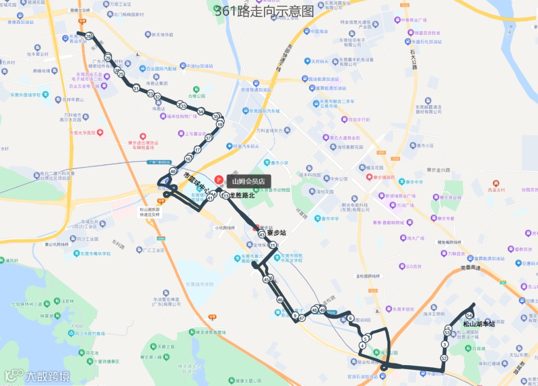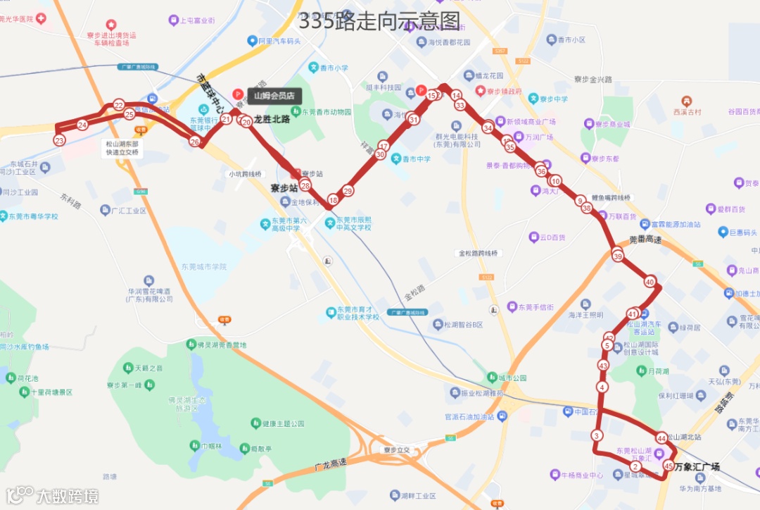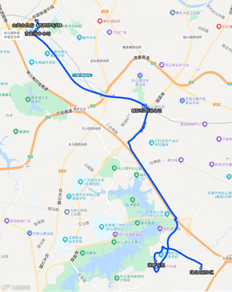 往绿岛花园方向:山姆会员店(西侧停车场内)、市篮球中心、松山湖北站(A出口)、湖畔花园、绿岛花园B区