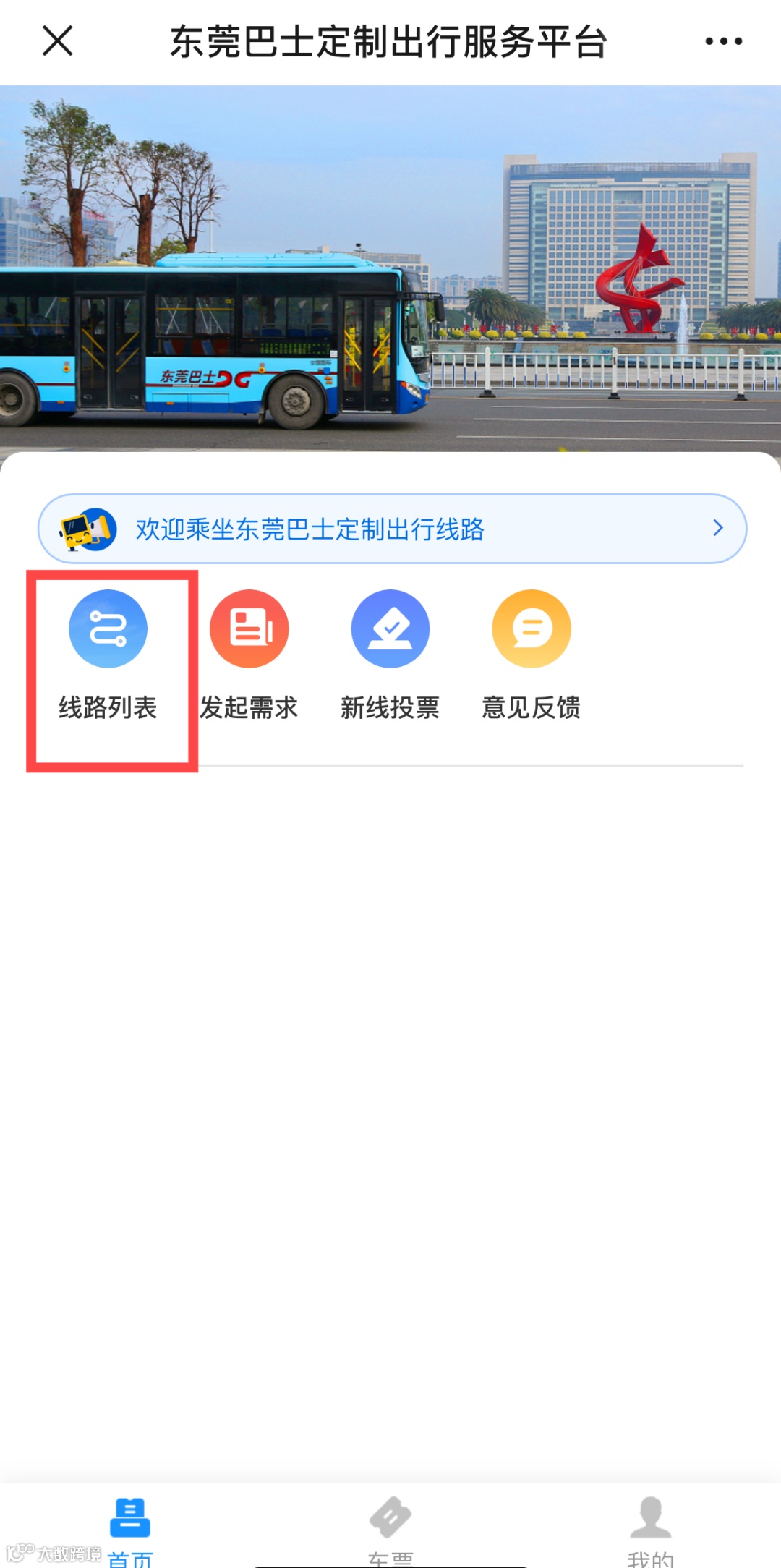 2.进入菜单栏,点击“特色公交一定制出行一线路列表”,搜索“山姆店定制线路”购票乘车。