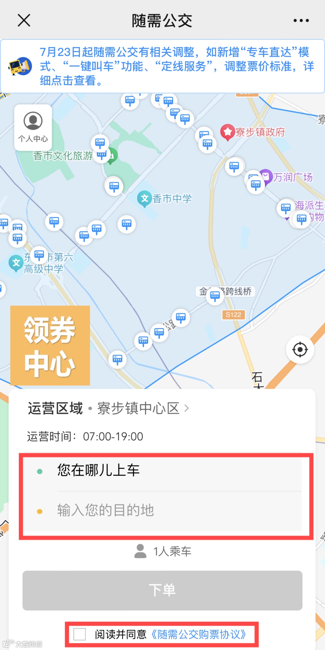 2.进入菜单栏,点击“特色公交一随需公交”,选择寮步镇中心区,填写上下车站点和人数,即可随需出行。