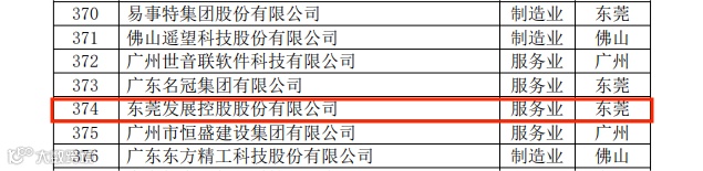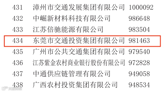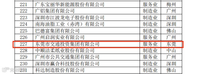 9月11日,“2024中国服务业企业500强”榜单发布,东莞交投集团首次上榜,位列第434名。9月20日,“2024广东企业500强”榜单揭晓,交投集团再次蝉联榜单,位列第227名,较上年提升35位;下属上市企业东莞控股公司同列此榜,位列第374名。