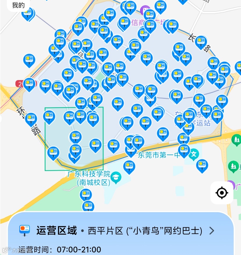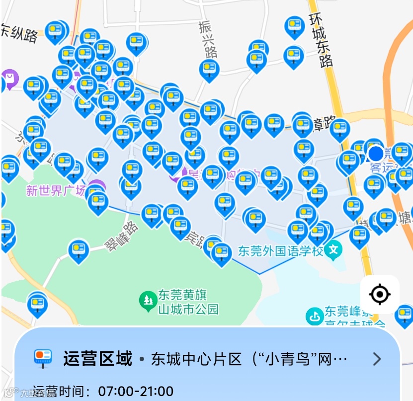 2023年11月16日,“小青鸟”网约巴士率先在东城中心片区开通,开通初期设有站点286个,其中区域内站点222个、区域外站点64个。2024年1月12日,东莞巴士将西平片区随需公交升级“小青鸟”网约巴士。运营一年以来,根据市民出行特征和意见反馈,不断优化站点设置,如今两个运营区域的服务站点增加至307个,日均客流1100人次。