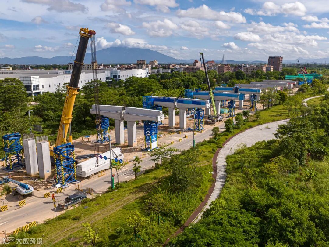 环莞路北延线工程的预制装配一大亮点是在我市首次采用分离式大悬臂预制盖梁吊装工艺,单个分离式预制盖梁重约213吨,安装支架采用装配式钢管柱支架,可根据每个支墩的节段高度进行组合配置,满足不同盖梁高度拼装要求,盖梁湿接缝施工创新设置专门的操作平台,施工安全又高效。